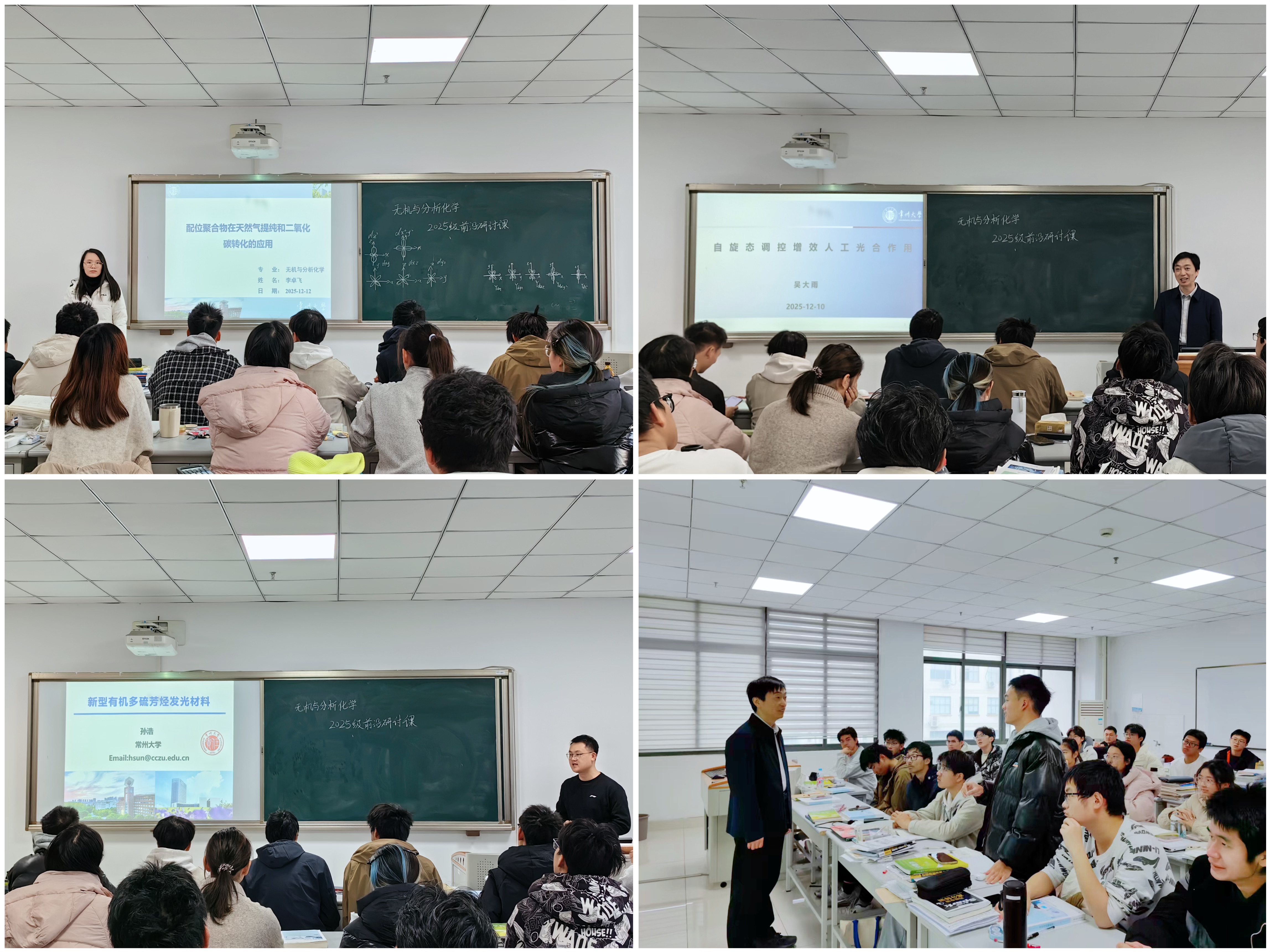 本次研讨课内容紧扣课程核心知识体系并聚焦学科前沿最新动态。吴大雨教授以“自旋态调控增效人工光合作用”为题,从配位化学基础理论切入,阐释其在光催化二氧化碳还原前沿领域的创新应用;李卓飞教授结合2025年化学诺奖热点,生动讲解了配位聚合物在气体分离与转化中的应用,通过展示实验过程与数据分析,具象化地呈现了基于课程知识的科研路径;孙浩博士围绕“新型有机多硫芳烃发光材料”,深入分享了无定形双发射材料的研究突破,拓展了学生对分子功能化的认识。