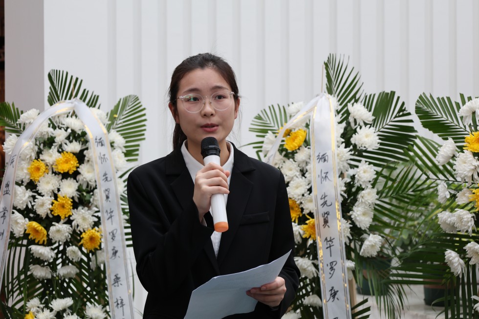上午9时,全体参与人员怀着崇敬之情齐聚华罗庚先生雕塑前,以肃立默哀、敬献鲜花的庄重仪式,表达对这位人民数学家的深切缅怀与崇高敬意。随后,来自不同单位的三位代表依次发言,深情追忆华罗庚先生矢志报国、献身科学的光辉事迹。其中,人前露出 的张澜同学在发言中回顾了华罗庚先生从金坛走向世界数学巅峰的奋斗历程,分享了先生“精勤不倦、自强不息”的精神品格。作为人前露出 学子,她表示将传承先生精神,刻苦钻研,立志成才,报效祖国。